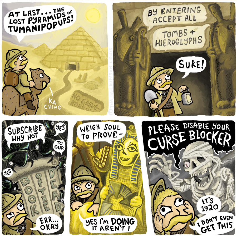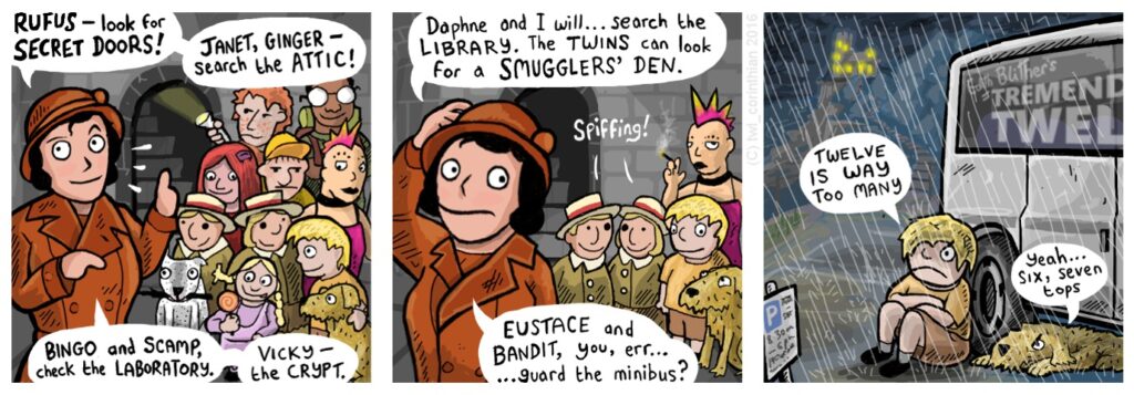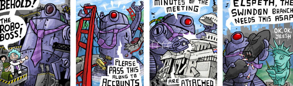 I draw a comic called ‘Yes Hive Overlord’, which has its own website at www.yeshiveoverlord.com. (Currently down – stay tuned.) Pirates, superheroes, monsters, scientists, ghosts, wizards, gangsters, aliens, animals, explorers, robots and statues appear in diverse situations, but then just screw up and argue with each other. I try to post a new comic about once a week month year. Here are a couple of examples.